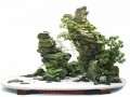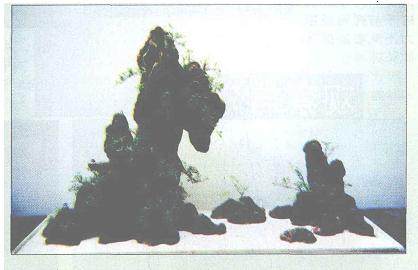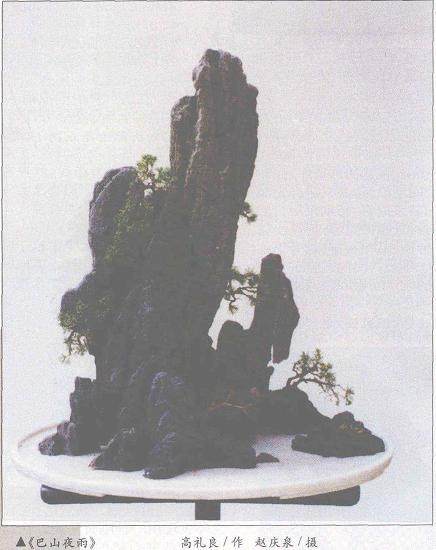 悬崖式山水盆景,追求山崖的惊险,如一味地追求平稳,则画面不生动,缺乏动势。因此,画面在感觉上应是下轻上重,下部作为一个基础去承担上部的生量和压力。