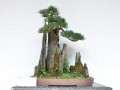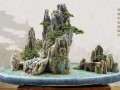 悬崖山水盆景,属于对山的近景的特写,用来反映自然界某一局部悬崖峭壁的惊险之态。盆中通常 有两组至三组山石,主山呈明显的悬崖状,置于盆的一侧,山头向 中间县出一部分。悬崖式山水盆景的动势较弱,掌握不好容易出现重心不移稳的现象。因此在制作时要注意以下几点: