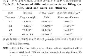 M1、M2 和 M3 处理的花生耗水量比裸地处理分别低 73.9,42.2,46.9mm,差异显著(p<0.05),但 3 种液态地膜处理的花生耗水量差异不显著。 M1 处理的产量和水分利用效率均为最高,分别为 50.9g·plant-1和1.9g·kg-1,显著高于裸地处理 。 但 M2 和 M3 处理的花生产量与 CK 处理的产量之间没有显著性差异 ,M3 处理的花生水分利用效率与 CK 处理的花生水分利用效率之间也没有显著性差异。 研究认为,高拉伸强度液态地膜在改善土壤水热状况、提高花生产量和水分利用效率方面效果最优。 今后在液态地膜产品研制和改进过程中,可以适当增加液态地膜的拉伸强度。