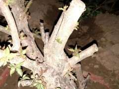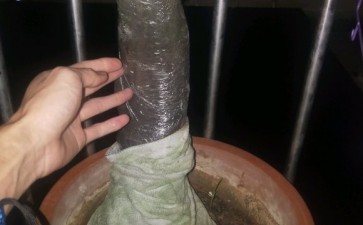对于枝干的截面,我先是用红霉素涂抹,然后再用农业上常用的塑料薄膜把截面扎好,这两样很重要,红霉素可以消毒杀菌,薄膜封口可防止树桩水分的流失。
