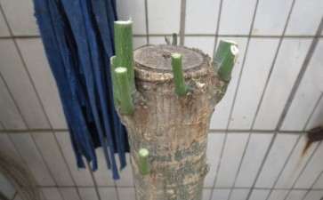 如果是我,我会用蜡封住上面,下面泡在多菌灵+生根粉调配的水里,十公分左右。泡一天拿出来,干燥地区晾几个小时,湿润气候地区视情况而定,椰糠配细河沙加水拌匀,拌成潮湿状况就行,栽进去十到八公分。