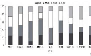 四川乡野杂草各科物种的相对丰度(即各科的杂草物种数目占比)随季节变化的规律明显不同。莎草科和唇形科植物的夏季相对丰度高,分别为52.38%、42.11%;苋科、莎草科植物相对丰度冬季及春季较低,夏季和秋季较高;伞形科和十字花科植物恰好相反,冬季和春季相对丰度较高,夏季、秋季则较低;蓼科植物相对丰度冬季最低,仅为10.53%;而禾本科和菊科植物的相对丰度季节变化差异不明显(图3)。