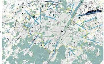 “道路成景”项目的一副平面图展示了设计区域的定向结构(图4)——强方向、静态锚点和地标。这些图示有助于设计团队了解特定场地的路径必须应对的景观结构,例如伊萨河(River Lsar)的水草甸或宽阔的河床。另一幅平面图则显示了绿带中的道路网络设计(图5),设计团队针对不同使用群体的绿带目的地提供了多样的环形路径,增强了公共交通的可达性。人们可以在这些绿色基础设施上策划自己到邻近城市工作的通勤路线,并能在途中进行休闲、社交、娱乐和户外运动,从而接触到区域中的绿地并体验空间品质。由此,LGI让“可持续的流动”[43]成为可能。由可步行和可骑行的道路组成的弹性网络公共空间将地区与地区连接起来,并因其异构性(heterogeneous)和复杂性的空间模式而形成逻辑联系,从而促使新“纠缠”的产生。