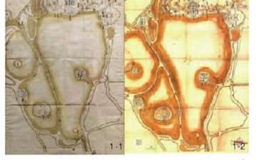 此外,通过实地调研并比照高精度地形图发现,《画样》中的山体虽然以象形的方式表达,但所绘的地形边界和陡坎的相对位置十分准确,山体和建筑群等要素的空间关系也与建成情况基本一致。结合清代工程技术背景看,要精确标记大范围、复杂场地的地形变化状况,并按一定比例准确绘制于图纸上,唯一可靠的方法就是借助平格技术。因此,《画样》绘制内容的准确度与模数化特征均可体现出其与平格技术的强关联性。