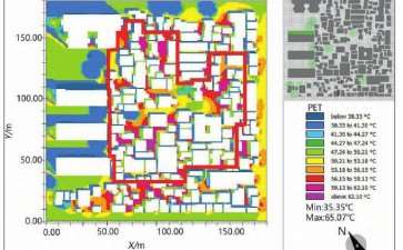 3)目标。在微尺度场地中,户外人体热舒适度是人类对热环境满意与否的心理状态[16],是评估城市小气候质量的重要参数[17]。本文选取当前研究最为广泛且包含气温、湿度、风速、平均辐射温度和人为因素影响的生理等效温度(PET)作为GI调控策略成效的判断标准,生理等效温度高于41℃则被认定为处于高温风险中[18]。因此将PET降低至41℃以下作为场地降温目标。