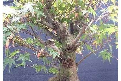 合栽式的制作,须注意主次、疏密、高低、远近等方面的处理,可参考金钱松合栽式的布局,所不同者金钱松多为直干,而鸡爪槭常带弯曲,故合栽时还须注意树干弯曲的方向、程度,做到统一协调。