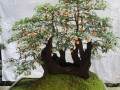五、管理:第一年上盆后应不急于其结果,最好将花疏除,以培养树形和来年结果枝为主。新梢长出20厘米时多次打头,一般树种在6~7月为花芽分化期,这时一般不再打头,可将旺枝拽平,控制水份和养份、促其花芽分化。其它整形手法还有:做弯、拧干、环剥、造伤、蟠扎、提根等选择应用。一般果树均喜光、抗寒。苹果、梨、冬红果一般需异花授粉(大部分品种白花也能结果),可人工辅助。桃、柿、杏、李、山楂、石榴等一般可白花授粉。温室栽培需人工辅助授粉。