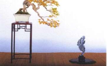山石盆景的布置陈设,还要考虑季节的更迭,如春景清怡含笑,夏景浓郁如滴,秋景萧疏明丽,冬景黯淡沉郁。盆景与室内环境的烘托关系很大,在选择背景色调时,般以浅色为好,若以蓝色作衬景,则能使人联想起大自然景物中的天幕。但是天幕的色调仍可变化,背景的色调如在浅灰色至蔚蓝色之间选择,亦富有诗意。当然,用白色或黄色亦未尝不可。