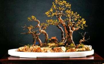 3、树:树木盆景的特征是:干弯、枝曲、叶细、根露,表现树木的古朴、秀雅、苍劲、奇特、自然、飘逸、豪放等精神风貌。