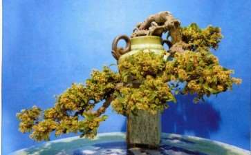 此外,盆景美不美,它的造型形态也容易给人直接的感觉。盆景师法自然,造型千姿百态,但不管何种造型形态,首先是要表现自然之美。这就是要看其是否因树造型,是否符合大自然树木生长的规律和人们的审美要求。如一般来说,大树型要婆娑苍劲,直树型要轩昂刚健,飘斜型要飘逸洒脱,悬崖型要跌宕飘垂,如此等等。总之好的作品要给人以自然、合理以及拨动心灵的观感,这就是盆景的型态美。不论那种造型,只要自然和谐,构图合理,比例适中,给人美感,就是好的型态。如能出奇制胜有新意,则更能使观者产生美的共鸣。